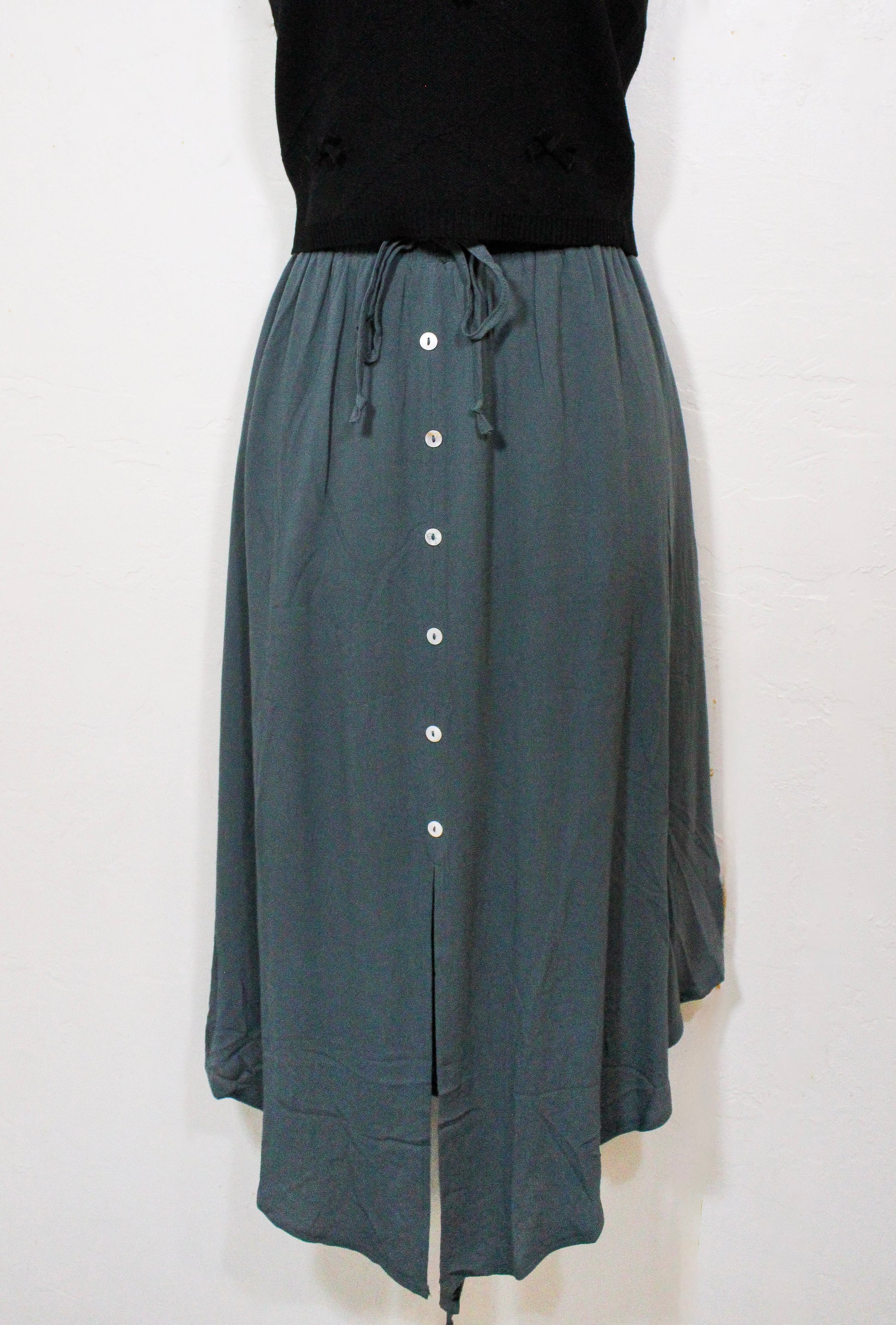 Evergreen button-front skirt with tie waist, featuring an unbuttoned center slit and asymmetrical hemline that's longer in the middle than the sides.