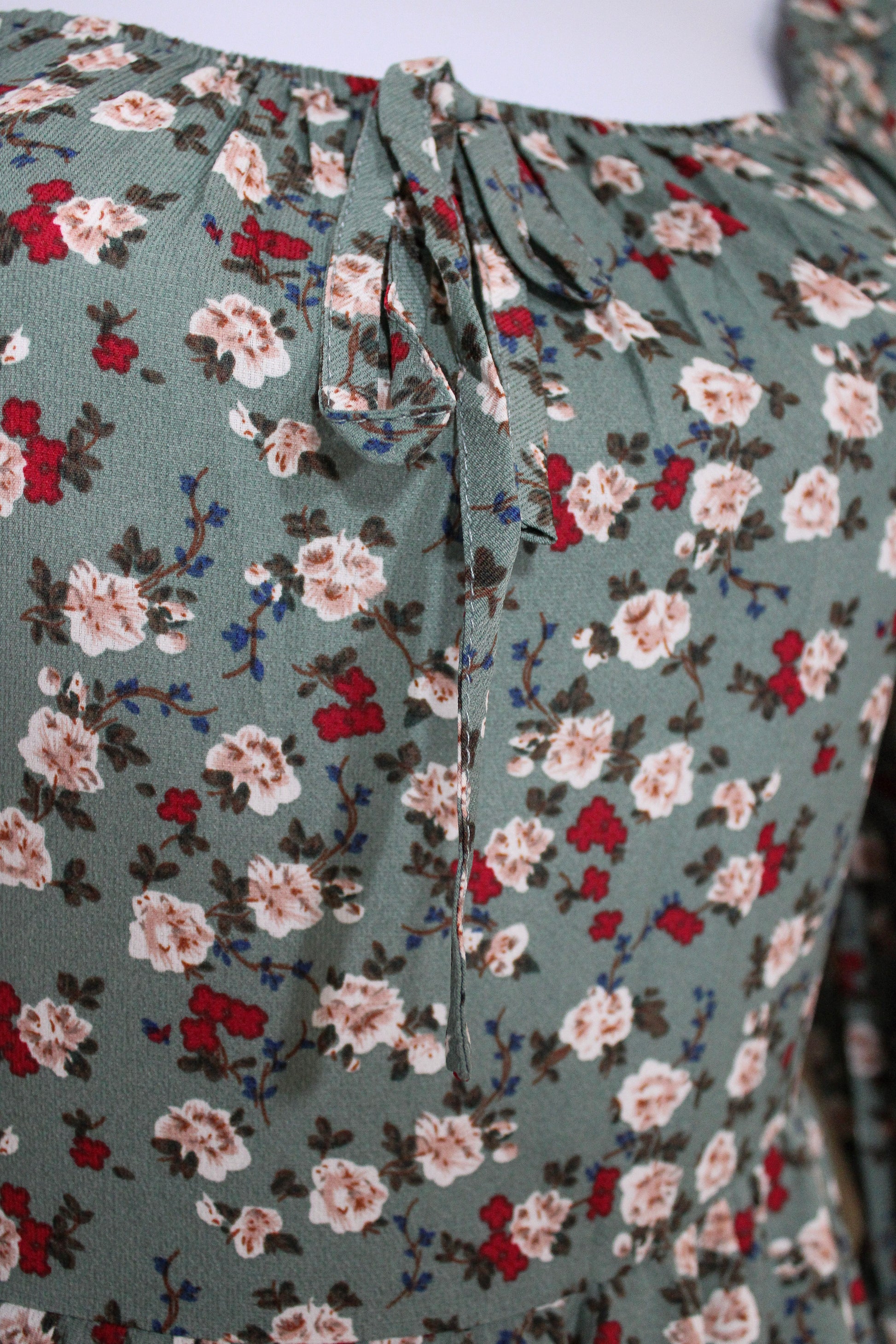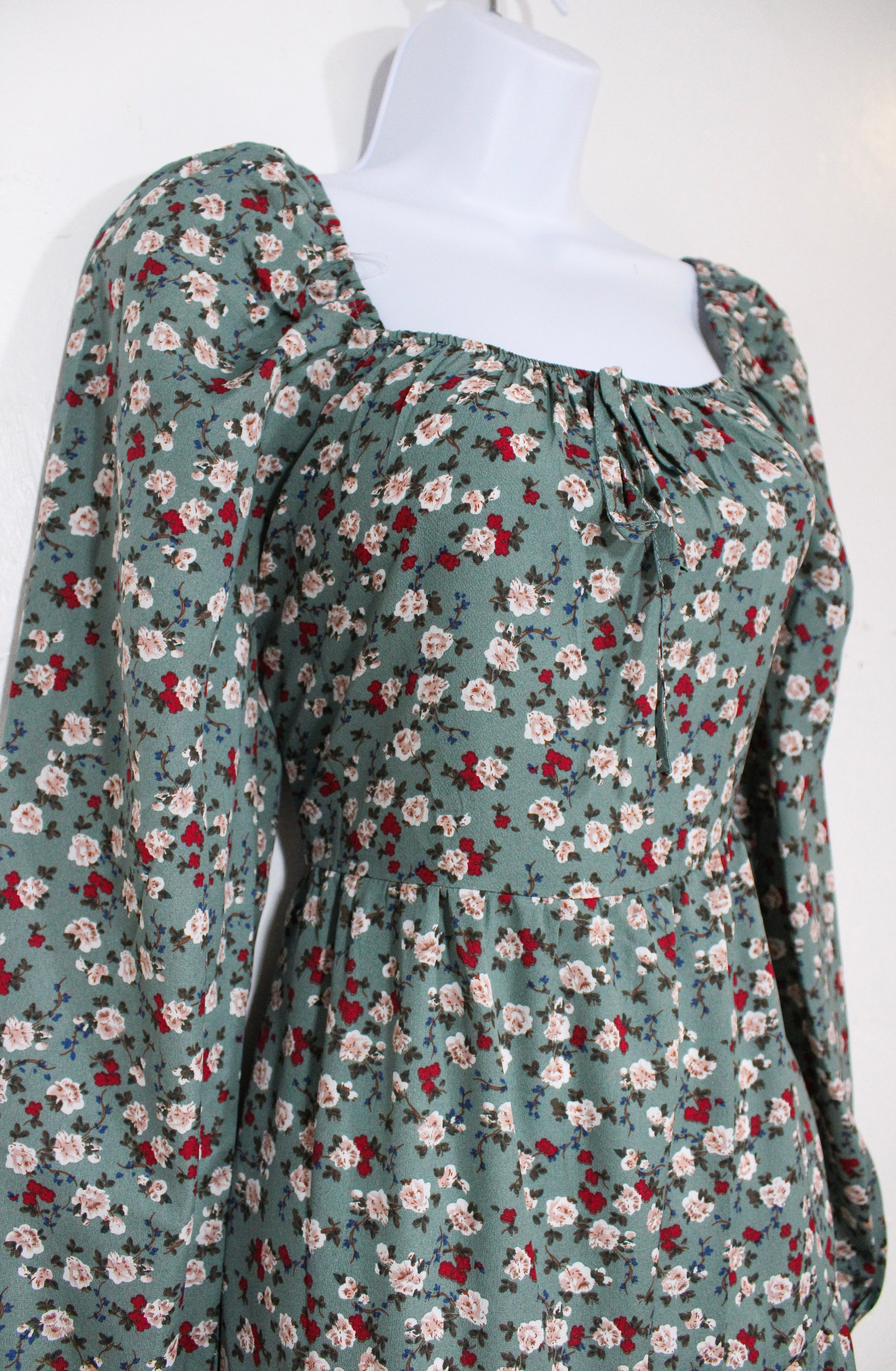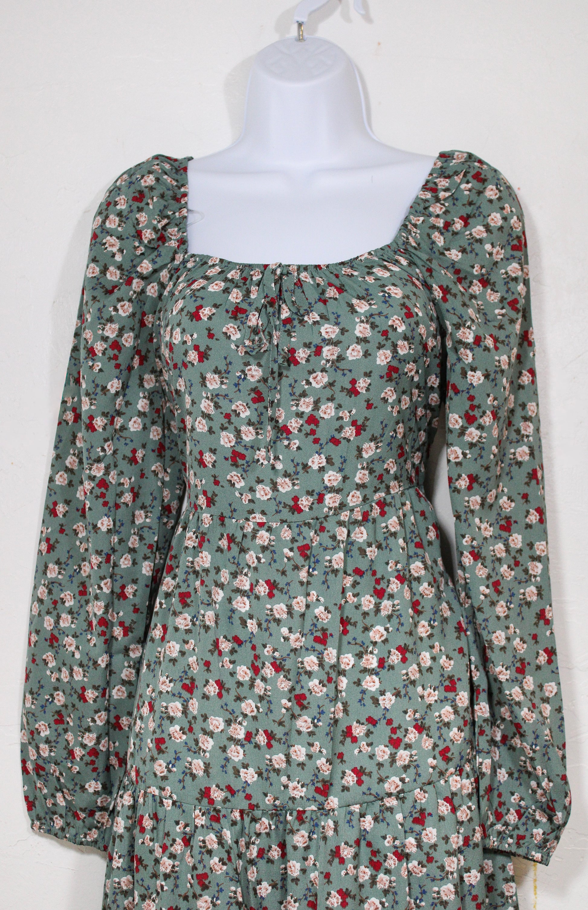 Dark sage dress with maroon and pink floral pattern, featuring a square neckline with center tie detail, long sleeves with subtle puff and elastic cuffs, and tiered seaming in a medium-long length.