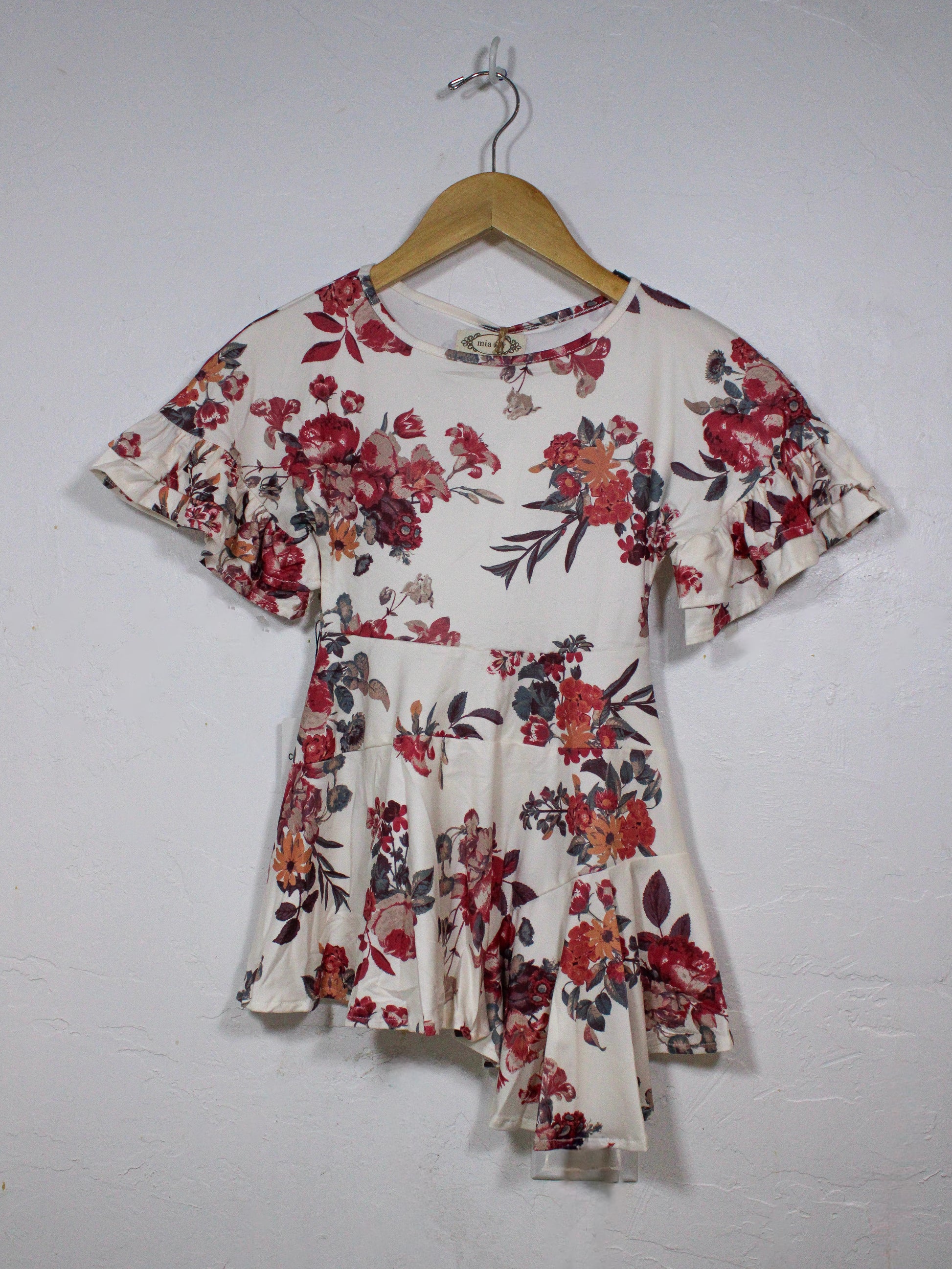 White kids' dress with maroon and green floral pattern, featuring short sleeves with ruffle cuffs and an asymmetrical hemline that's longer on one side.