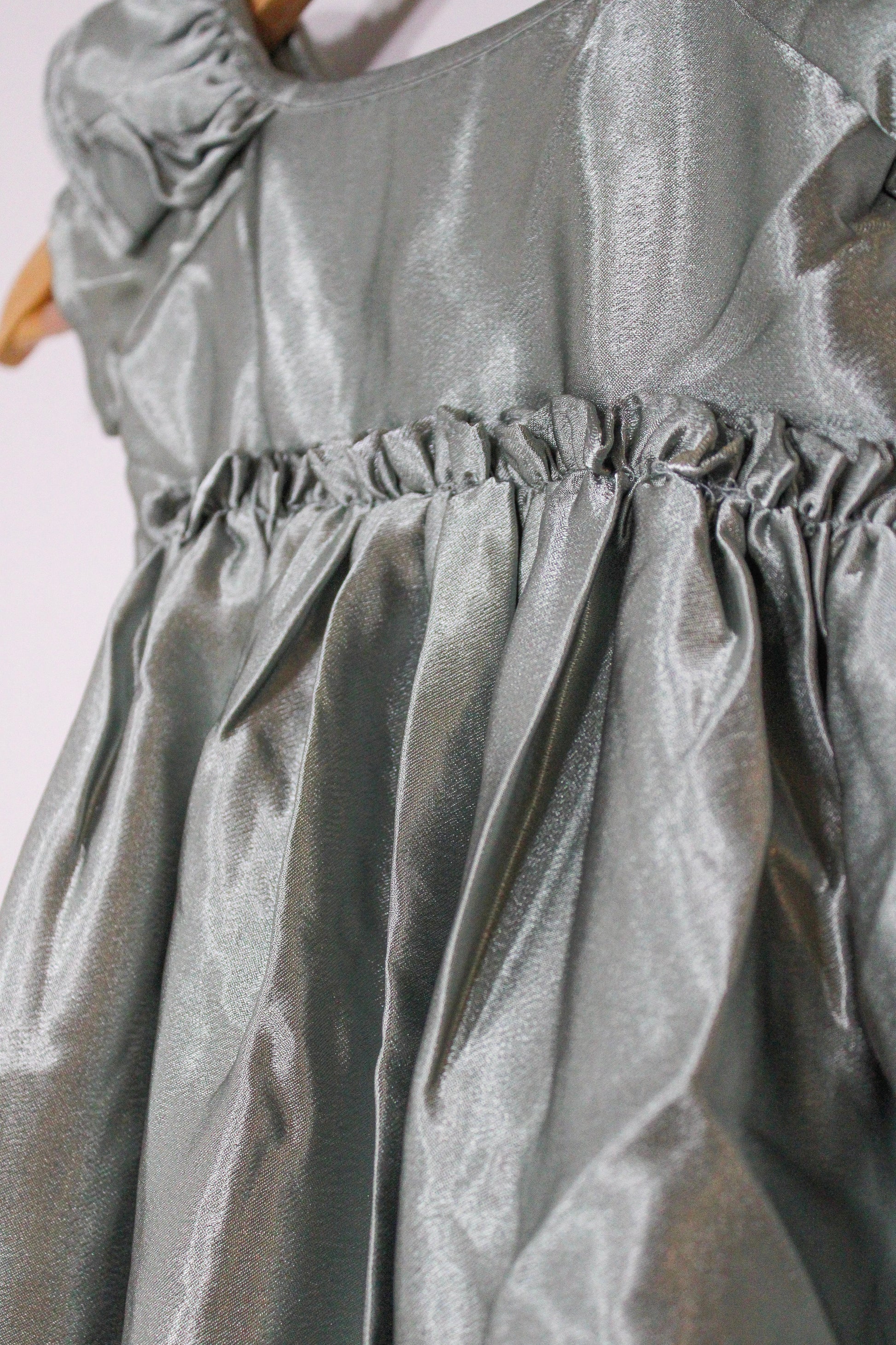 Sage green kids' dress with metallic sheen, featuring short sleeves with ruffle details and gathered ruffle trim along the seams in a longer length.