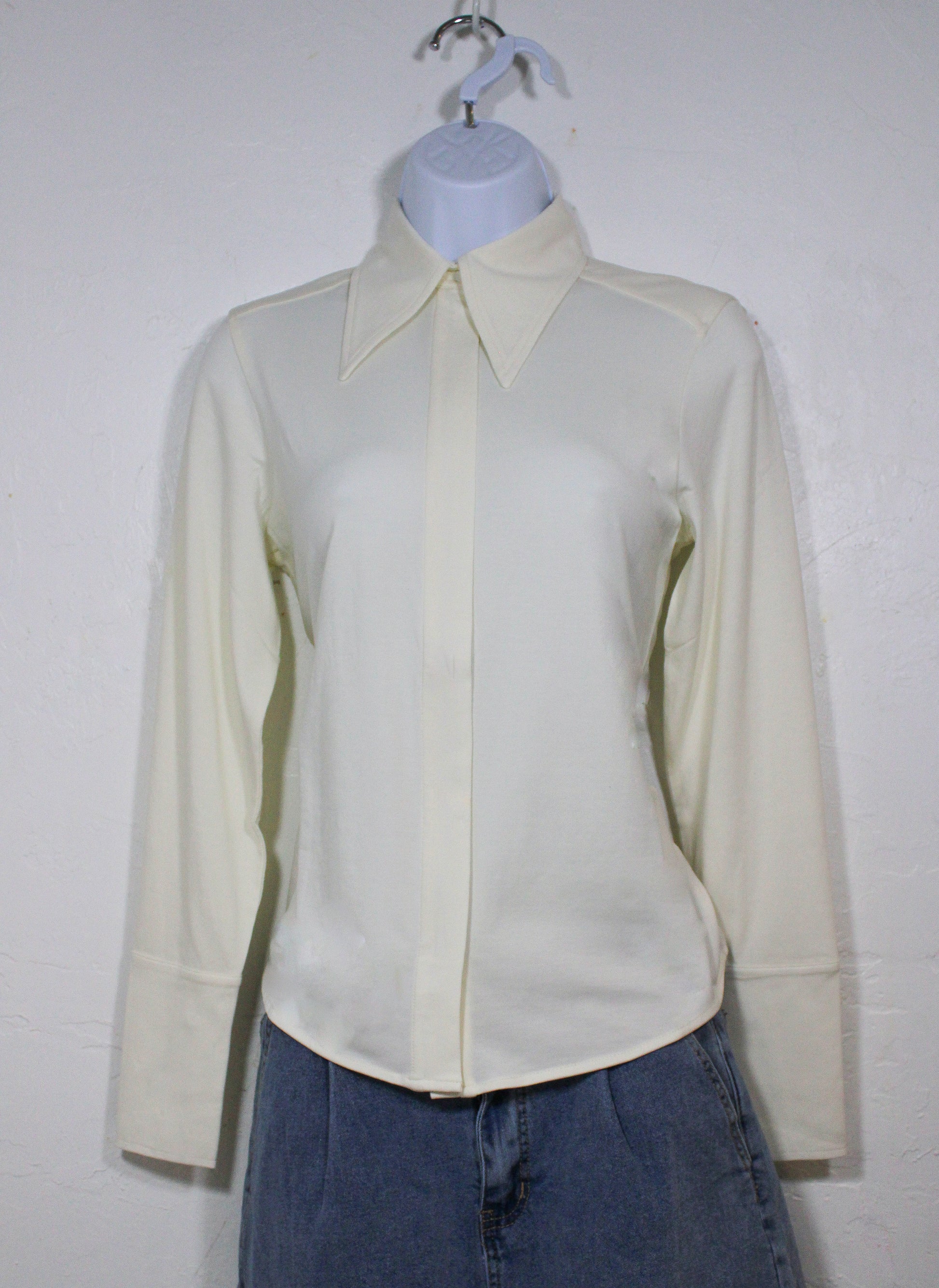 Cream long-sleeve zip-up cardigan with structured collar and hidden full-zip front closure. Made from soft cotton blend with ribbed cuffs and hem for comfortable layering and casual elegance.