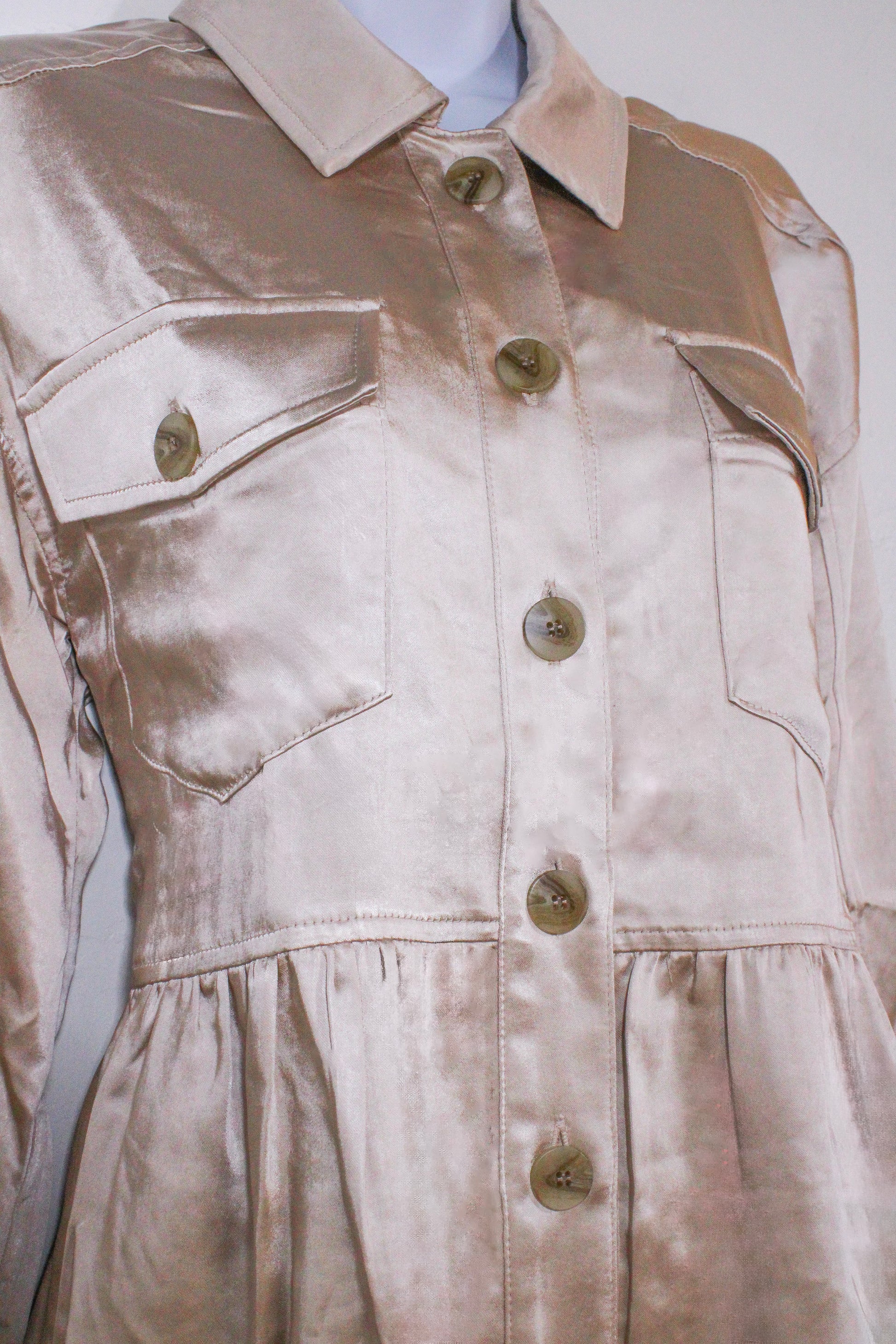 Mauve silky button-up shirt with a structured collar, chest pockets, and cascading ruffle detail through the lower section for an elegant, flowing silhouette.