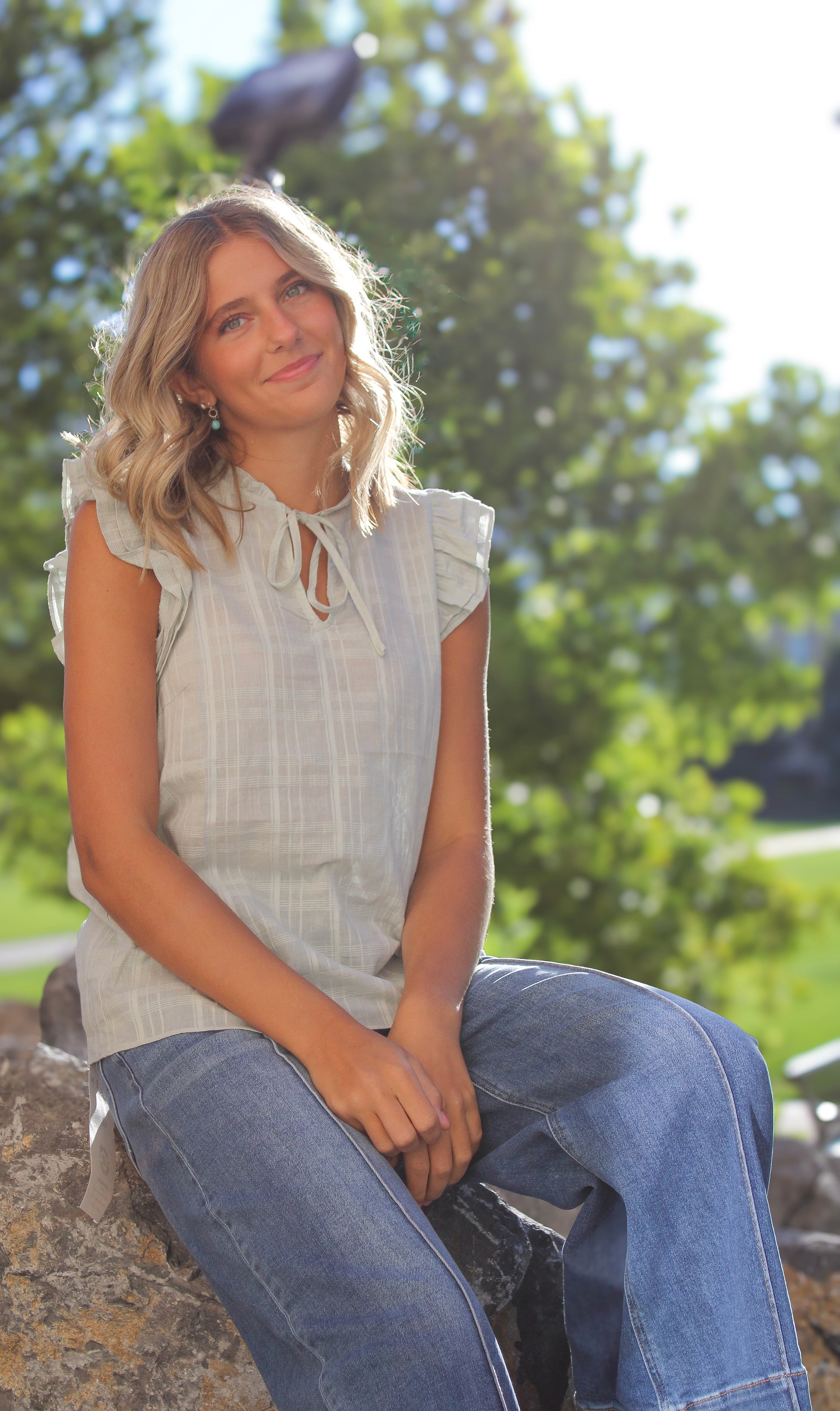 Sage green tank top with ruffle cap sleeves and a center tie detail at the neckline that creates a small keyhole opening.