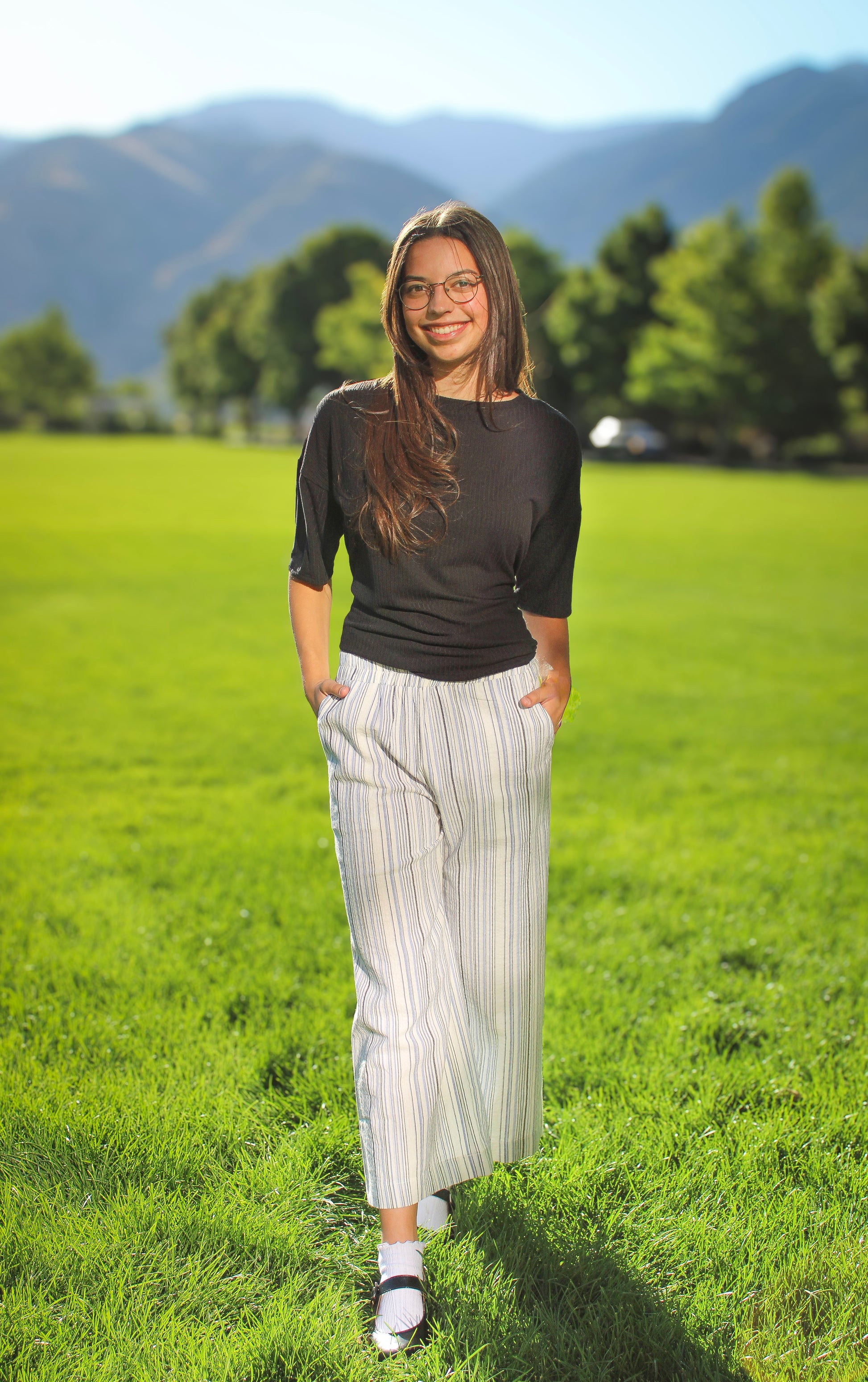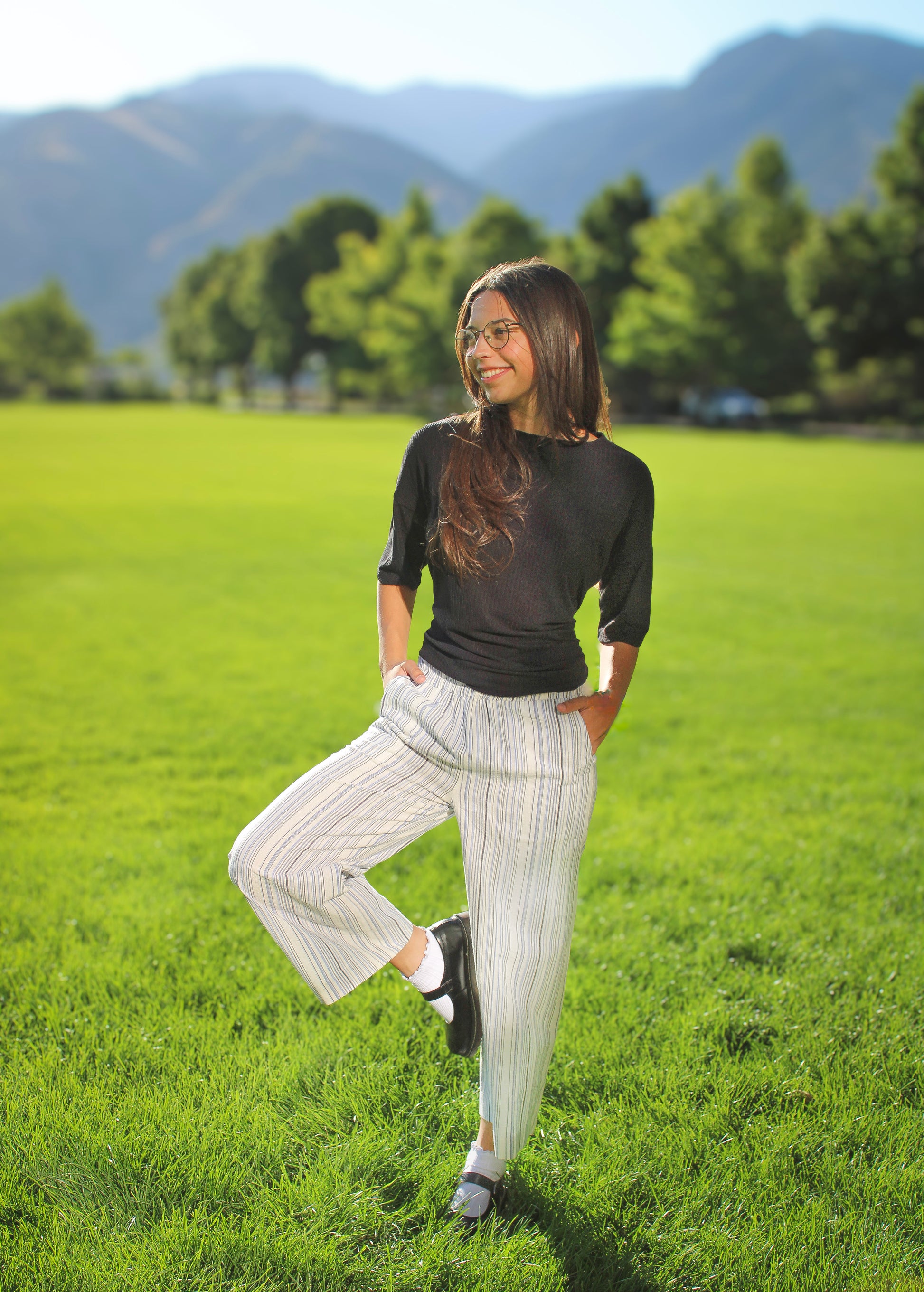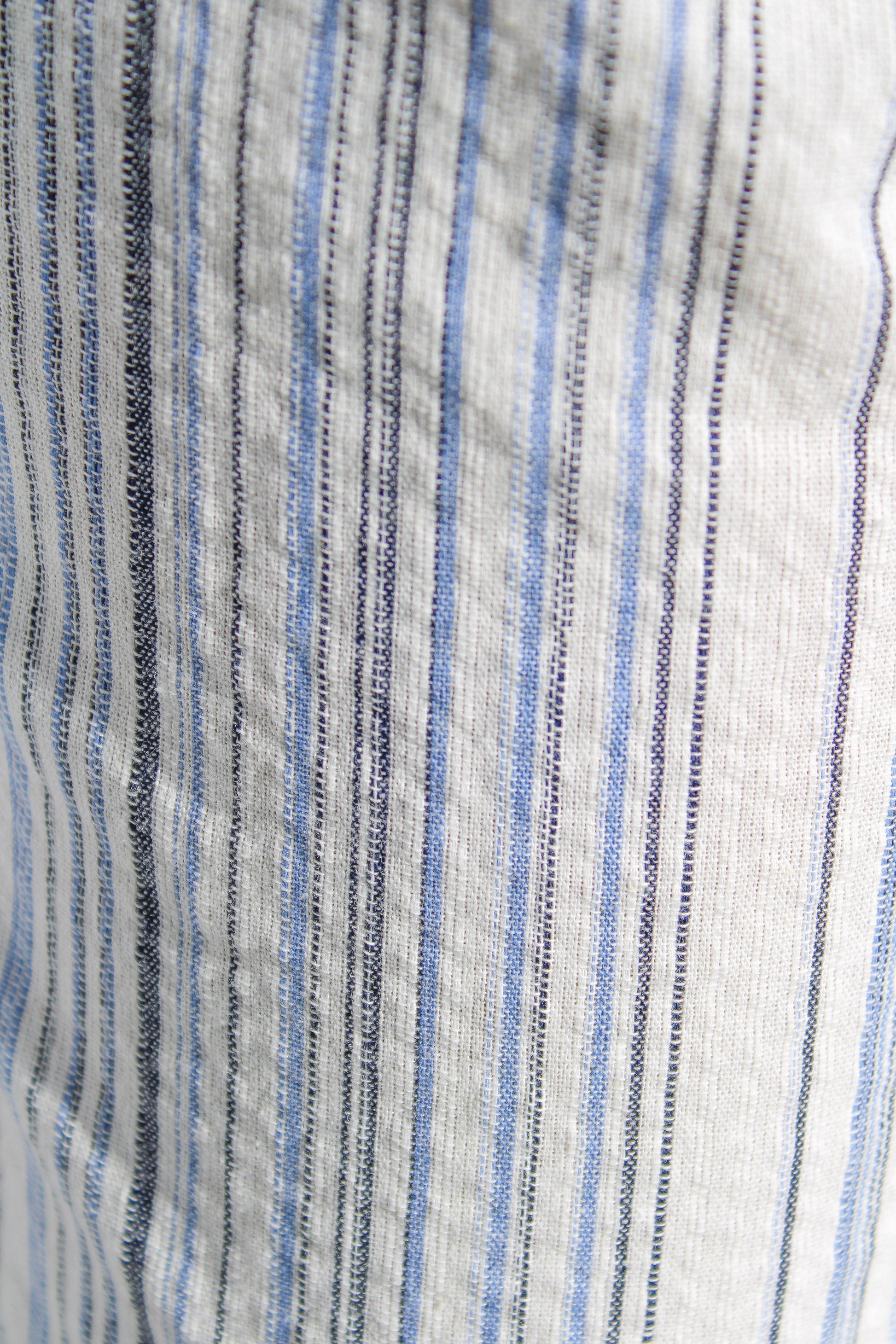 Breezy cropped pants in blue, white, and black stripes with a relaxed fit and elastic waistband. Made from lightweight cotton blend fabric perfect for warm weather styling and comfortable all-day wear.