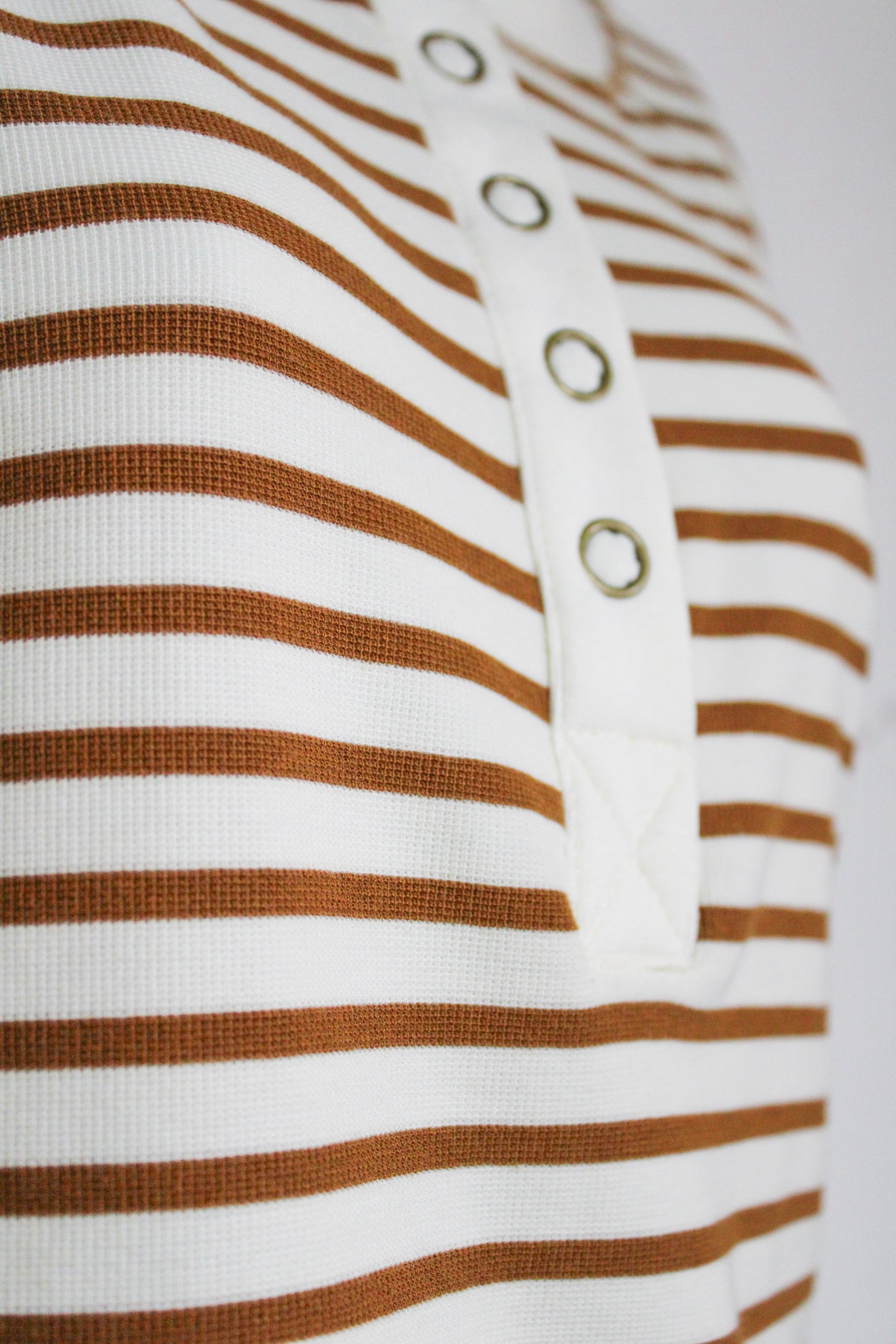 Cream and tan striped shorts with an elastic waistband and folded cuffs at the hem. Part of the Café Stripe collection including tank, shirt, and pants that can be mixed and matched or worn as coordinating sets.