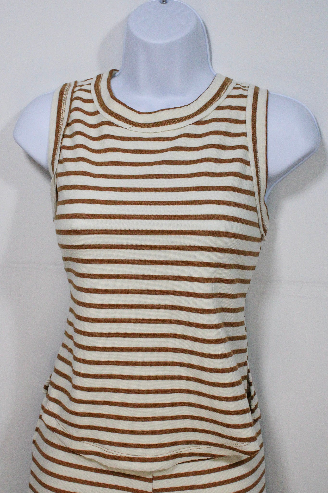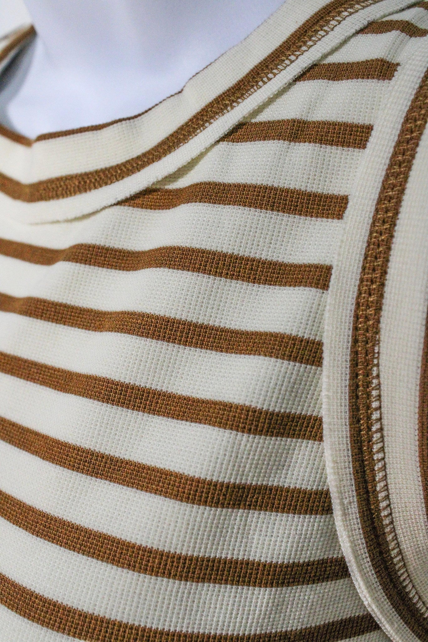 Cream and tan striped tank top. Part of the Café Stripe collection including shirt, pants, and shorts that can be mixed and matched or worn as coordinating sets.