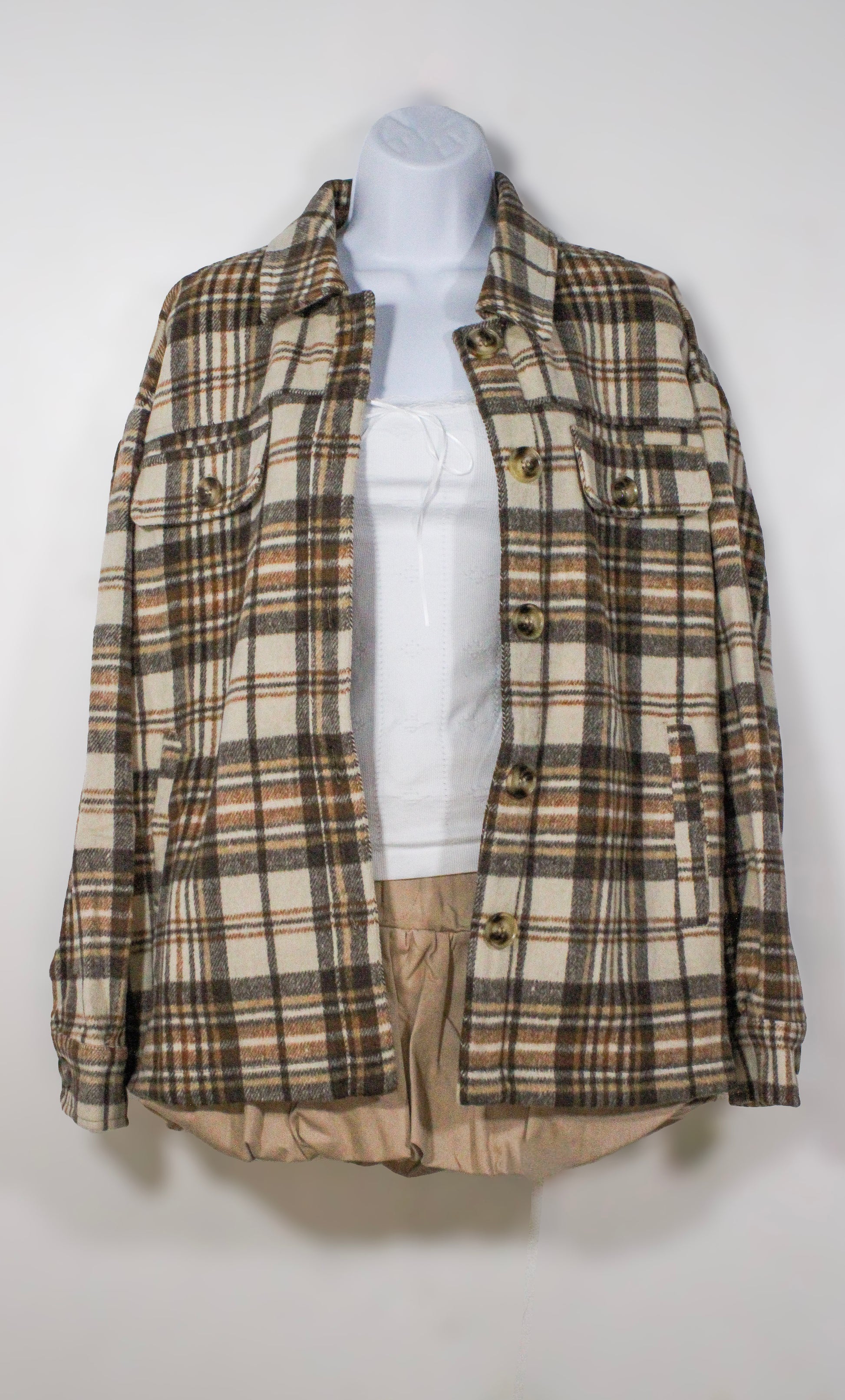 Rich brown and tan flannel shirt with an oversized fit and classic button-up design. Features a structured collar and convenient chest pockets for a timeless, cozy look.